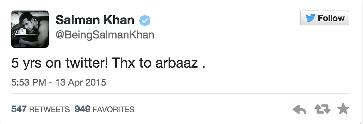 On Monday, Salman Khan completed 5 years on Twitter! He’s the only big star apart from Shah Rukh Khan who regularly tweets and keeps in touch with fans.