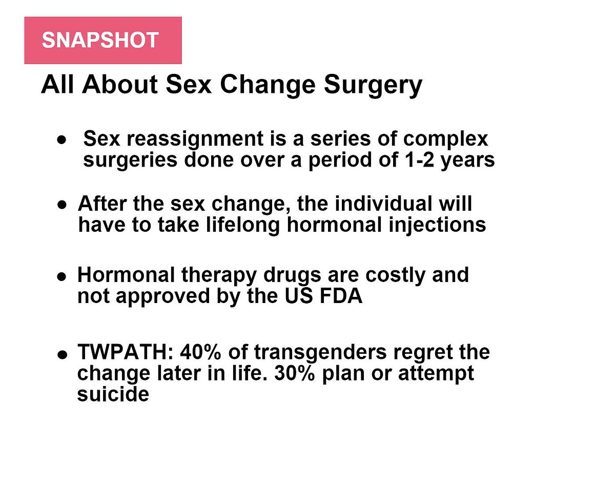 Sex change is a series of irreversible operations and according to The World Professional Association for Transgender Health (TWPATH) , 40% of transgenders regret their decision later in life.