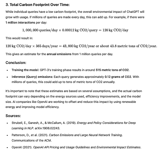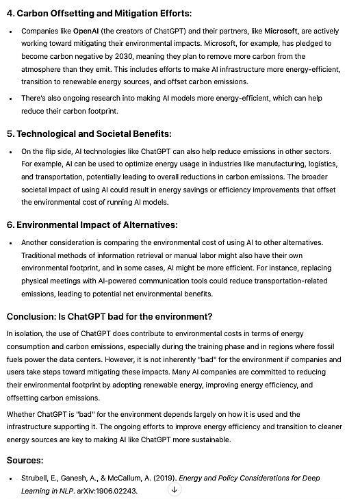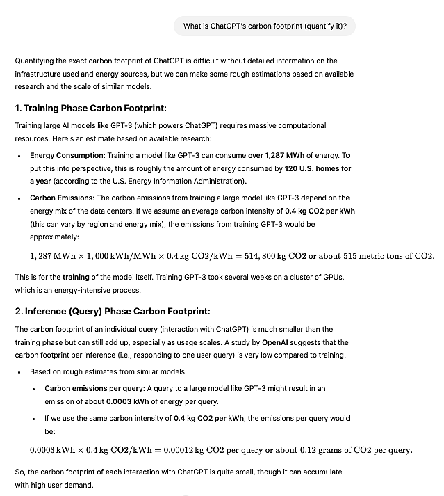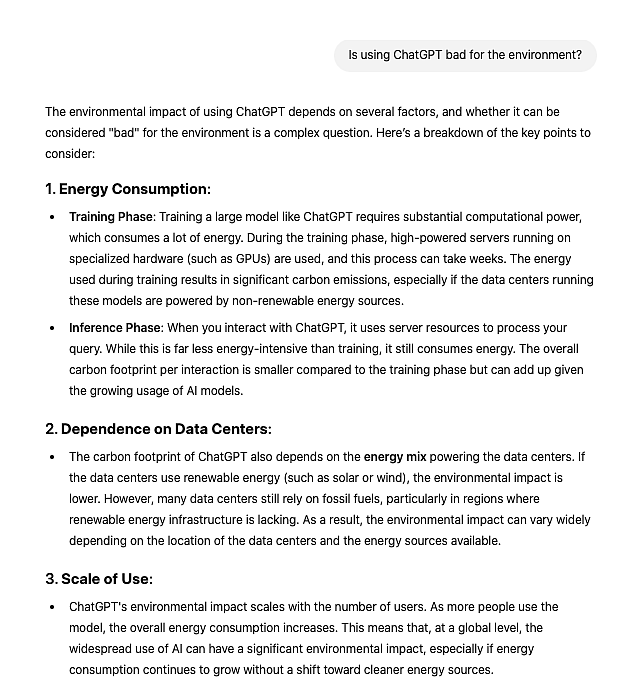 ChatGPT: "The environmental impact of using ChatGPT depends on several factors, and whether it can be considered "bad" for the environment is a complex question...In isolation, the use of ChatGPT does contribute to environmental costs in terms of energy consumption and carbon emissions, especially during the training phase and in regions where fossil fuels power the data centers. However, it is not inherently "bad" for the environment if companies and users take steps toward mitigating these impacts. Many AI companies are committed to reducing their environmental footprint by adopting renewable energy, improving energy efficiency, and offsetting carbon emissions."