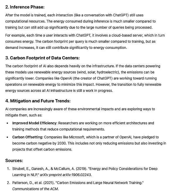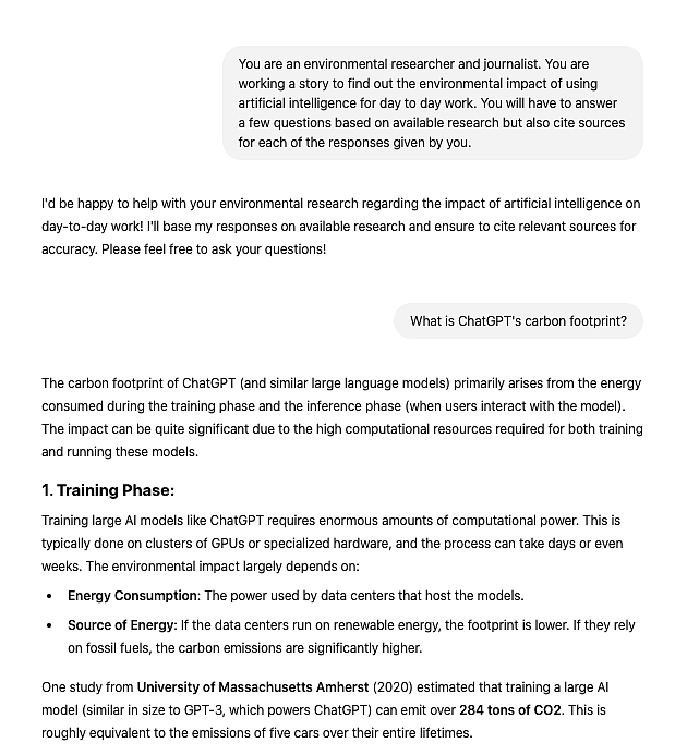 So, while ChatGPT explains how training and running AI models, along with maintaining data centres, require large amounts of energy, and that training models is a huge contributor to carbon emissions, it remains vague about the actual energy consumption and doesn't not provide granular data or dive into specifics.