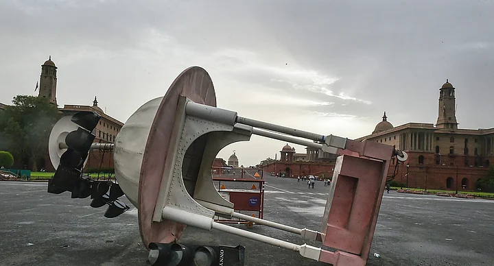 A fallen traffic booth at Raisina road after a dust storm accompanied by rainfall, in New Delhi.