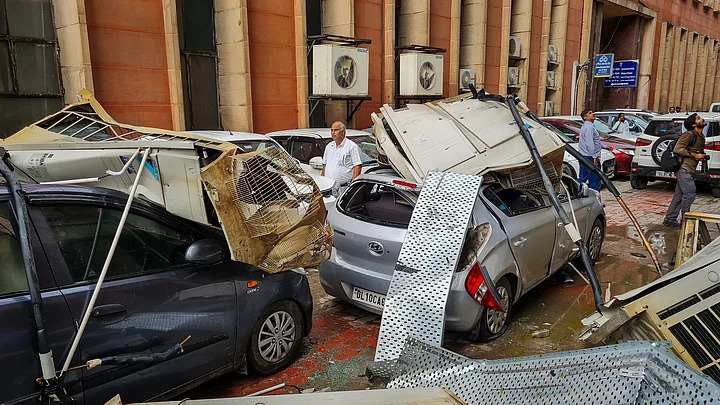 Damaged vehicles after Air Conditioners (AC) fell on them due to a dust storm accompanied by rainfall, in front of Parliament Street police station.