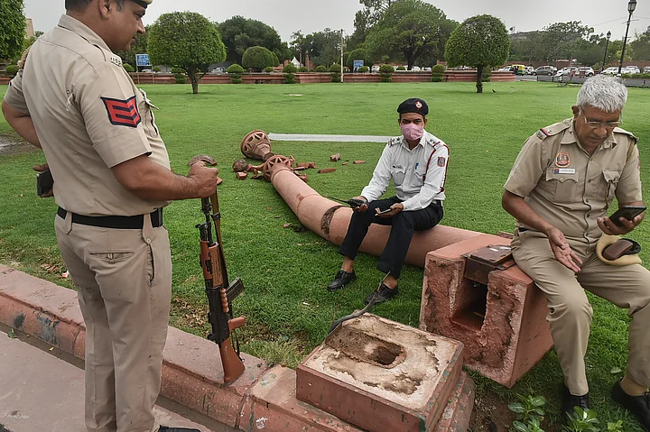 Security personnel rest after a pillar fell due to dust storm accompanied by rainfall, in New Delhi.