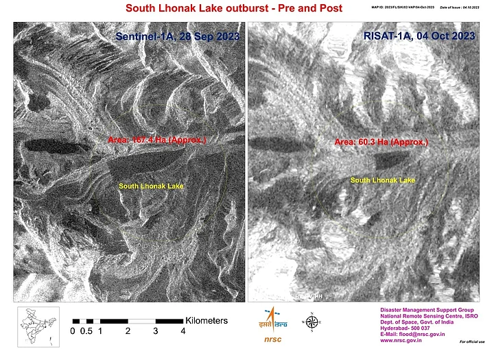 Pre & Post view of South Lhonak Lake as observed by RISAT 1A as on 4 October 2023 at 0600 hrs and Sentinel 1A as on 28 September 2023 at 1800 hrs.