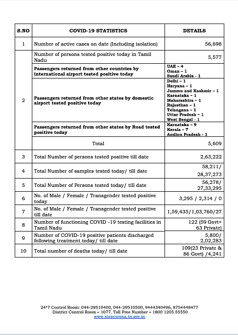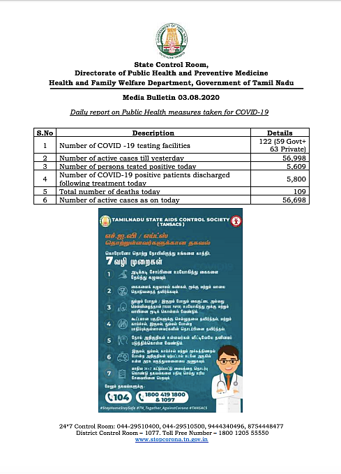5,609 Covid-19 cases reported in Tamil Nadu on Monday, 3 August. Out of these 1021 cases were from Chennai