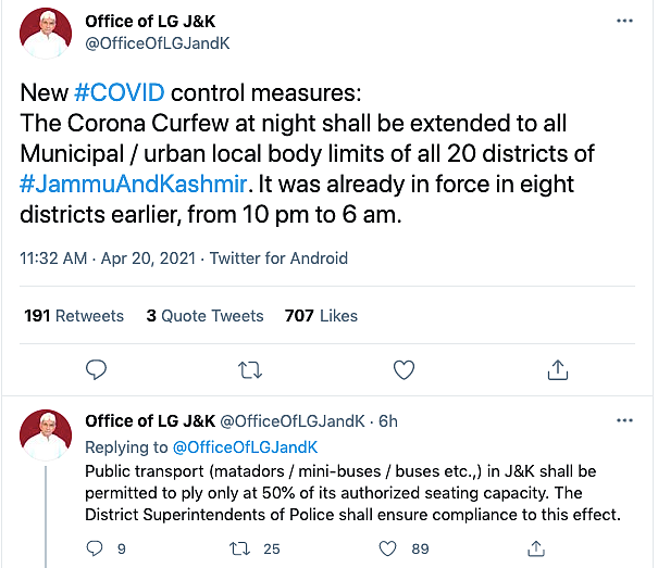 Announcing a slew of measures to check the COVID spread, Lt Governor Manoj Sinha said on his official Twitter handle, "The corona curfew at night shall be extended to all Municipal/urban local body limits of all 20 districts of Jammu and Kashmir. It was already in force in eight districts earlier from 10 pm to 6 am."
