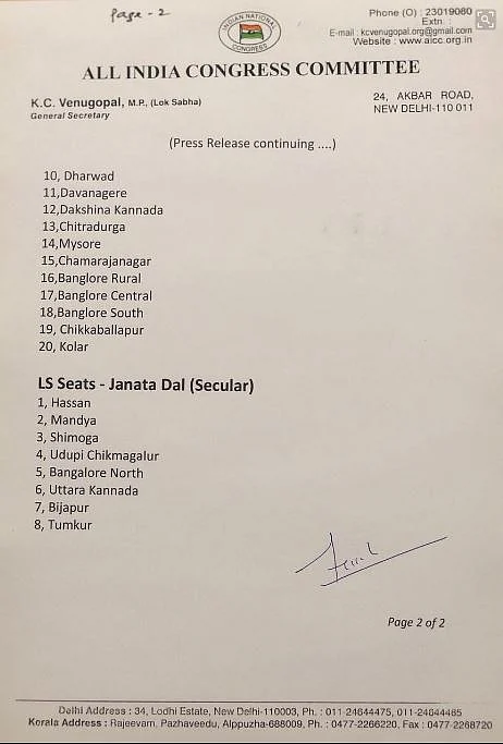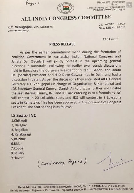 The JD(S) will reportedly contest in Uttara Kannada, Chikkamagaluru, Shimoga, Tumkur, Hasan, Mandya, Bengaluru North, Vijayapura.