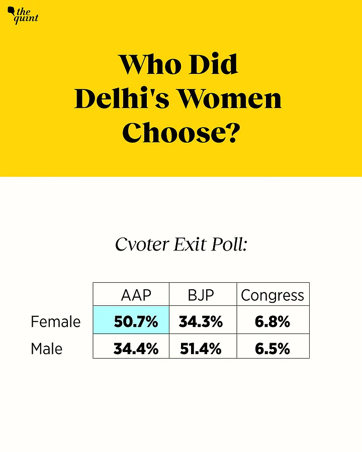 According to Cvoter exit polls, 50.7 percent women have favoured AAP, 34.3 percent women have preferred BJP and 6.8 percent voted for Congress.