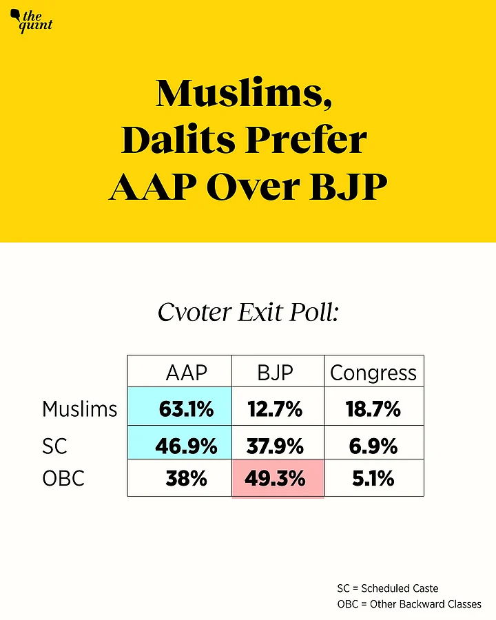According to Axis My India exit poll, 74 percent of Delhi's Muslims favoured AAP over the BJP. At the same time, 63 percent Jats preferred the BJP. Meanwhile, Scheduled Caste communities have also favoured AAP over the BJP.