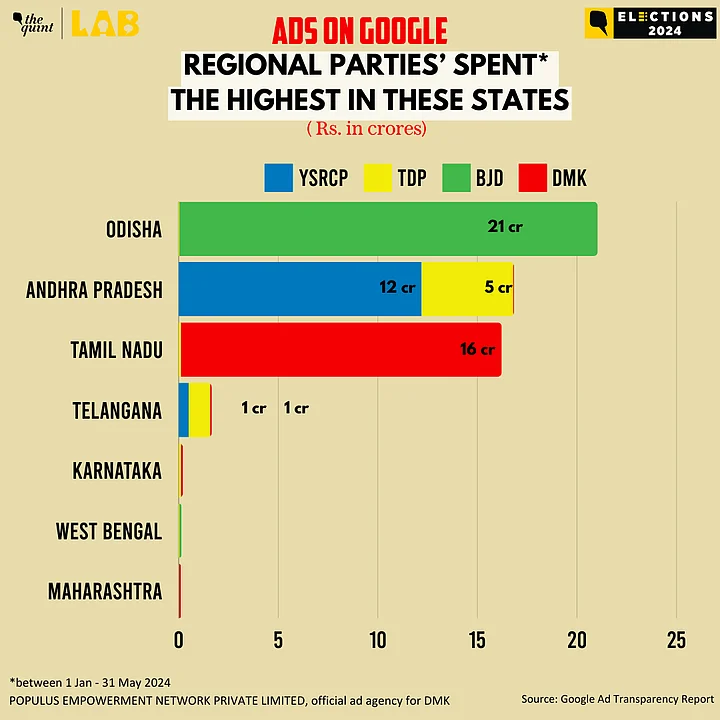 Regional parties also made significant investments: Biju Janata Dal spent Rs 21.2 crore, Dravida Munnetra Kazhagam (DMK) Rs 16.6 crore, Yuvajana Sramika Rythu Congress Party (YSRCP) Rs 12.8 crore, and the firm I-PAC, which advertises for YSRCP and All India Trinamool Congress (AITC), spent Rs 9.23 crore.
