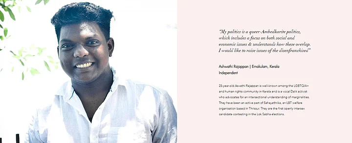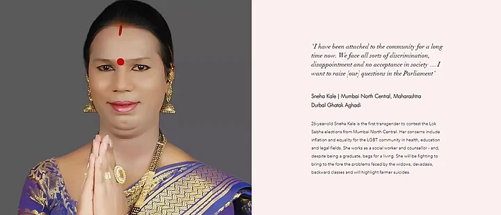 Dalit activist Ashwathi Rajappan is the first openly intersex candidate contesting in the Lok Sabha elections from Ernakulam, Kerala, while 26-year-old Sneha Kale is the first transgender to contest the Lok Sabha elections from Mumbai North Central.