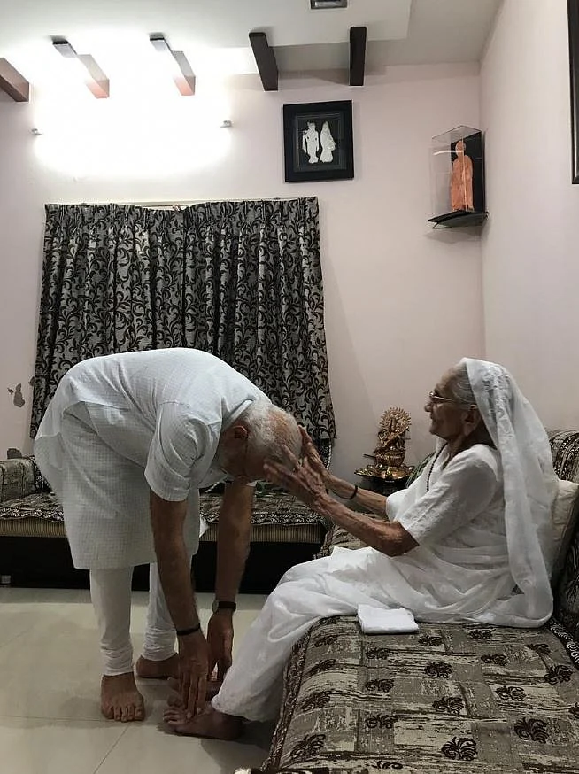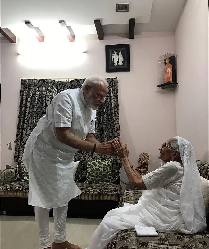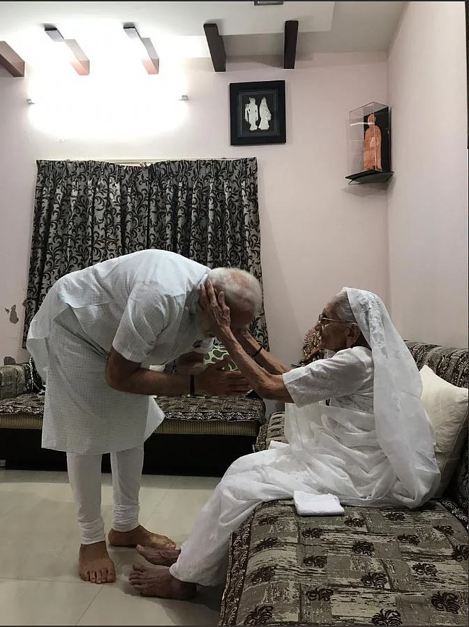 PM Modi makes it a point to meet his mother regularly before important occasions such as elections. Even before he went to a polling booth in Ahmedabad on an open SUV on 23 May during the national election, PM Modi spent 20 minutes with his mothe