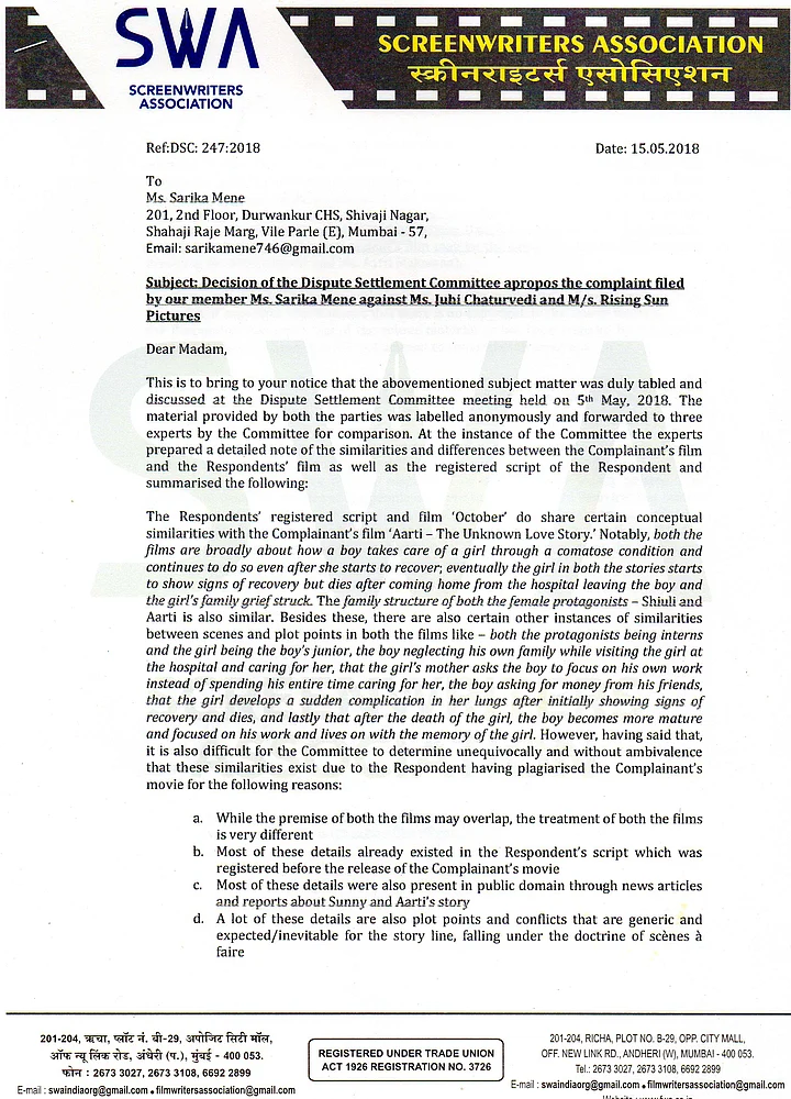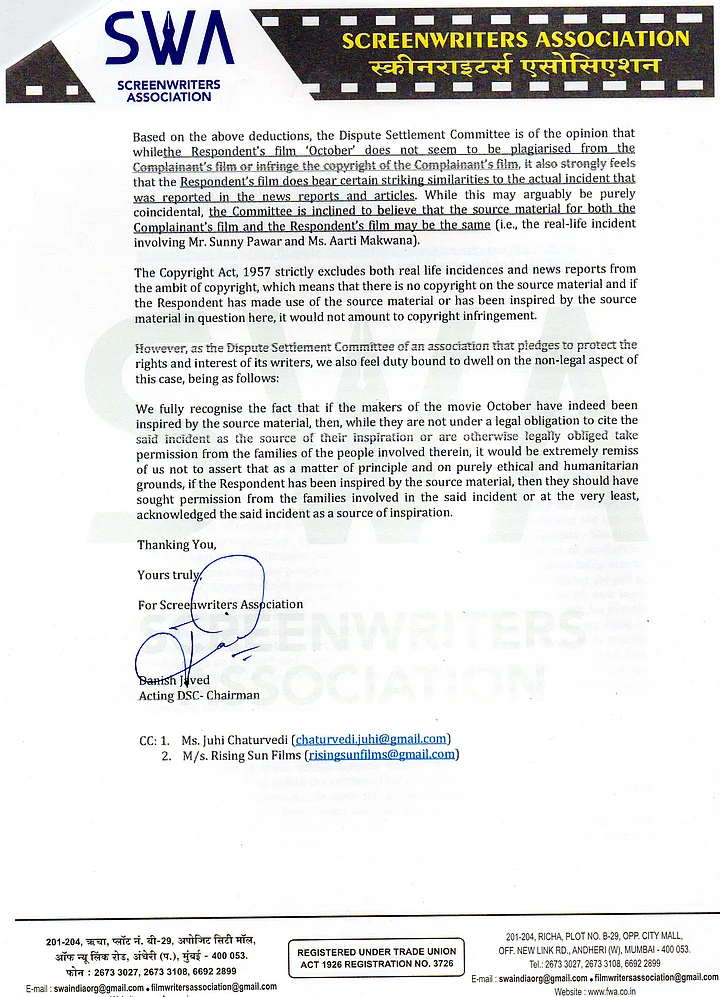 “We will surely respond to the letter officially. And post which we will let you know our official statement...We understand that there are some allegations of copyright infringement against our film ‘October’. We are creative people and have full faith in our work and our team, which has given extraordinary films like Piku, Pink etc. We have not heard of the film Aarti nor do we have full details of the matter as yet. We are sensitive towards feelings of filmmakers. We will look into this and deal with it appropriately.”Shoojit Sircar told The Hindu.
