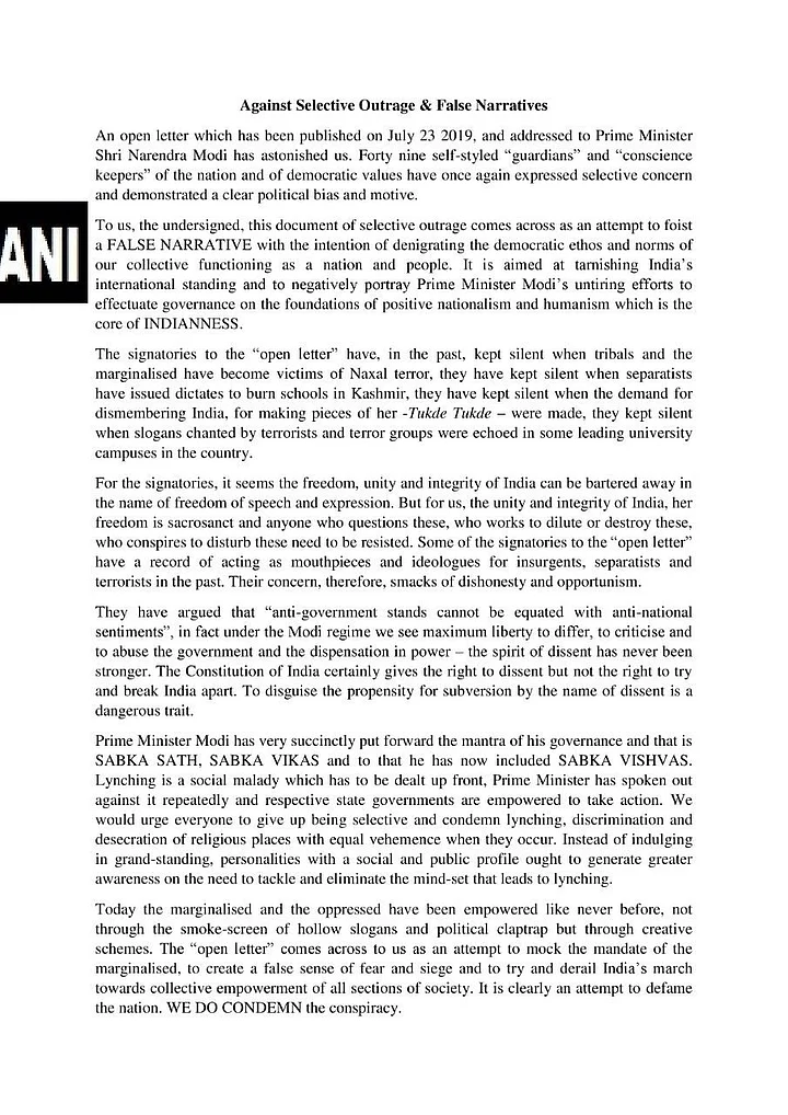“The ‘open letter’ comes across to us as an attempt to mock the mandate of the marginalised, to create a false sense of fear and seige and to try and derail India’s march towards collective empowerment of all sections of society. It is clearly an attempt to defame the nation. WE DO CONDEMN the conspiracy.”