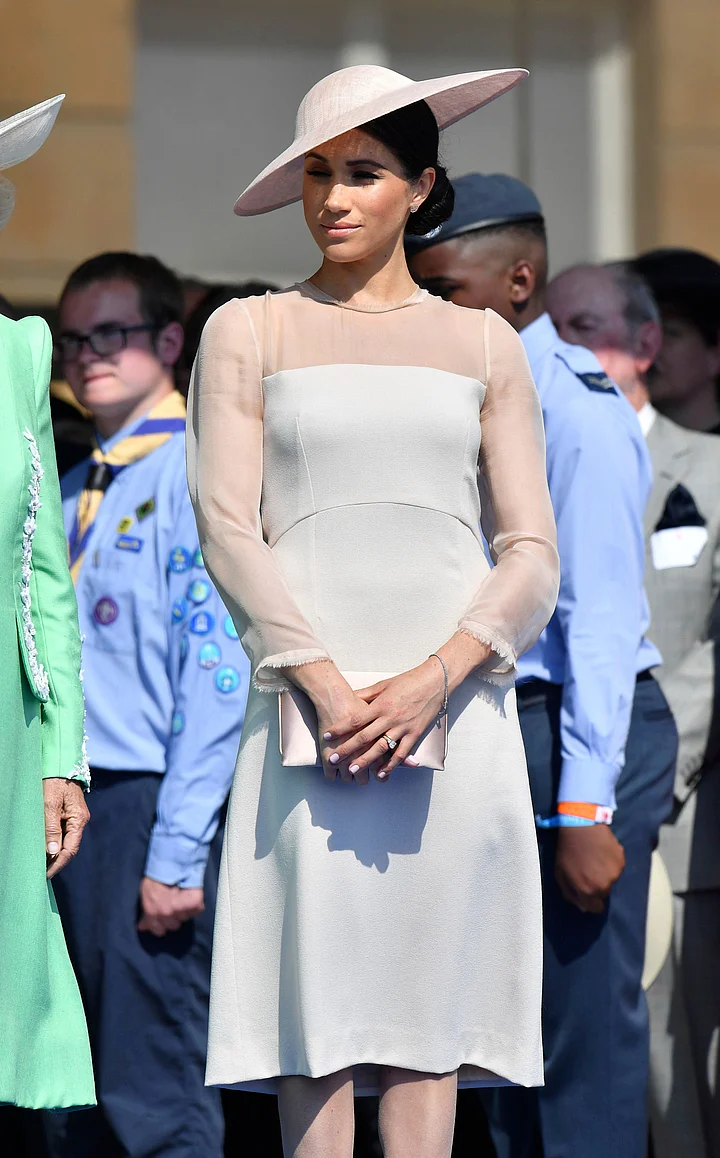 Meghan chose a pale pink dress by British label Goat for the occasion, worn with a matching saucer-style hat by milliner Philip Treacy.