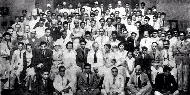 - 09/10Team of Bombay Talkies with journalists and special guests at the preview show of Savitri (1937) at the Bombay Talkies studio, Malad.Photo Courtesy: Pinterest