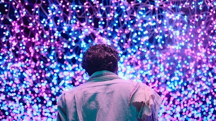 The camera zooms out a little to reveal a huge hoarding with a certain Jaadugar P.P Sharma’s face peering down at his mutilated body. It’s a staggering frame, setting the tone of magic realism and quite literally the circus that is to follow his death. Soon, the police arrive and the siren lights create a dramatic effect. Aditya S Kumar’s camera lingers deliberately, absorbing the details of the environment.