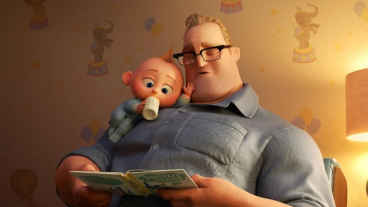To Bob’s (Craig T Nelson) disappointment, Helen (Holly Hunter) gets chosen for the role because Elastigirl holds a record of lesser collateral damage than Mr. Incredible. The film settles into a sitcom set-up: mom goes to work, and dad stays home. Elastigirl stops a monorail from crashing, saves a politician from certain death, and has to battle a bigger villain, but Bob staying at home has to deal with his teen daughter Violet’s (Sarah Vowell) boy problems, solve new math for over-speeding Dash (Huck Milner), and above all, confront the non-stop powers of their youngest, Jack-Jack (Eli Fucile). Fine, Elastigirl is on her adventure outside but the film tells us parenting is no less with daily wonders at home.