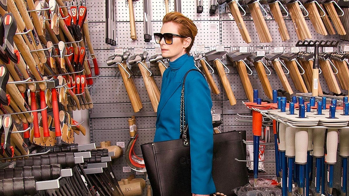 More monochrome outfits — red turtlenecks and blue pantsuits — follow, before her ultimate transformation in a yellow shirt with a floral motif, a plaid flannel, a black leather jacket and platform boots. Completing the outfit of this woman ready to move on is a gold Zippo.