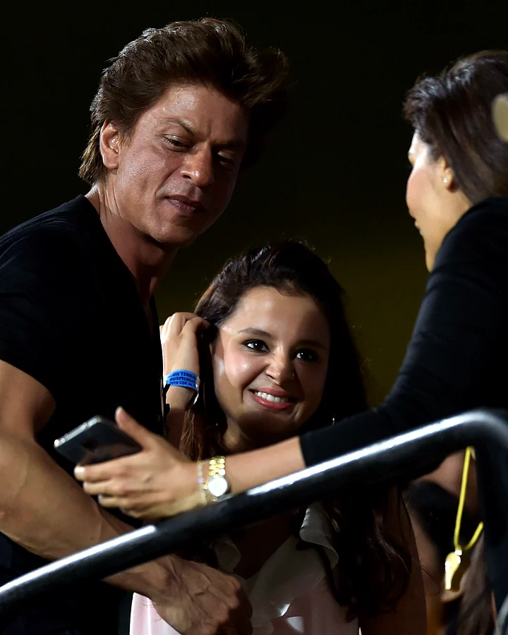 - 08/09Shah Rukh posing with Ziva while Sakshi Dhoni takes a pic.
