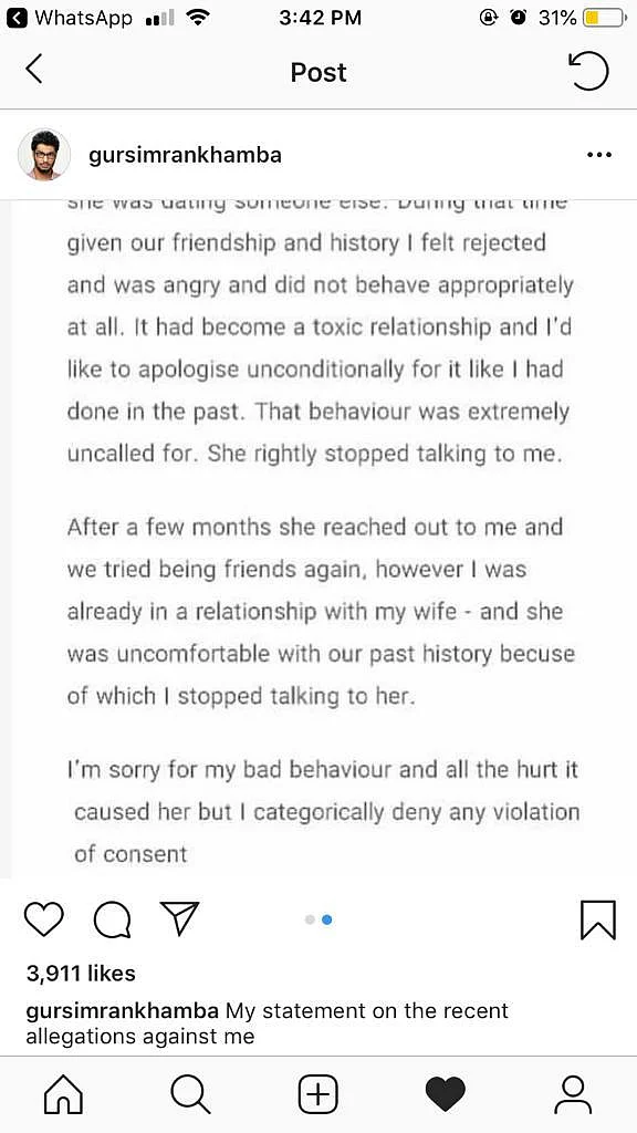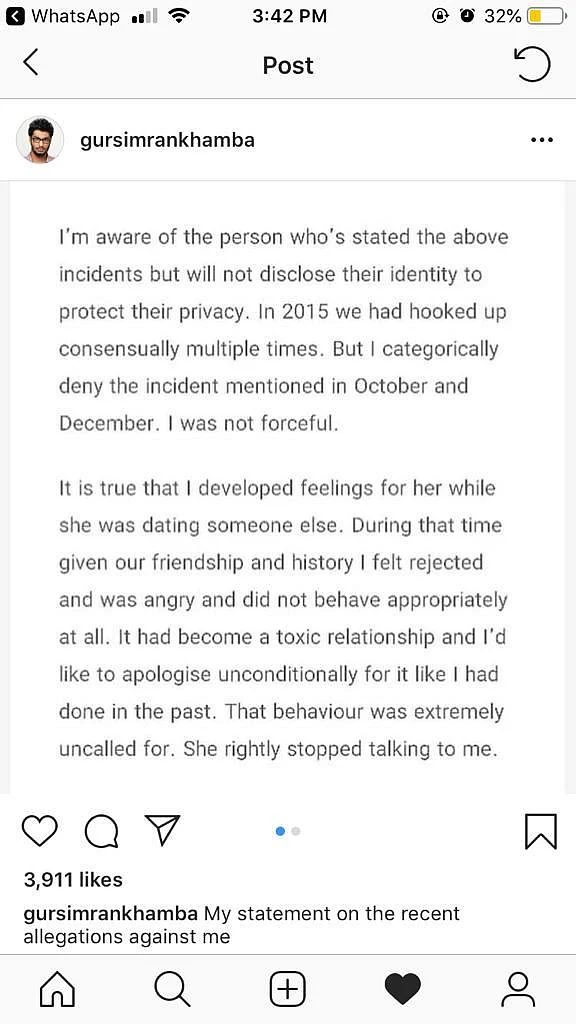 Khamba responded to the allegation through a statement, in which he apologised for his “bad behaviour” but denied breach of consent. He said that while he did develop feelings for her when she was dating someone else, he was “not forceful.”