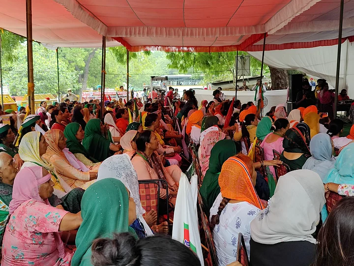 At least 200 women farmers made their way from Delhi's Singhu border to Jantar Mantar on Monday, 26 July, to mark eight months of farmers' protest against the three farm laws and hold a mock parliament against the same.