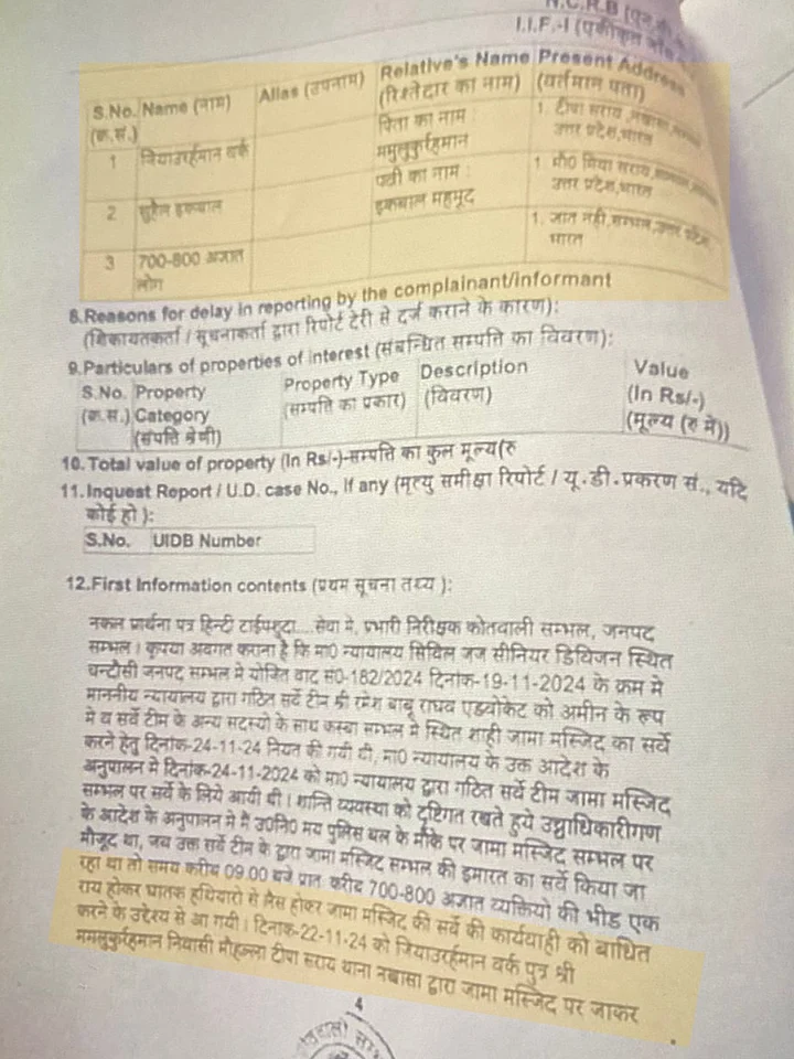 क्विंट हिंदी के पास मौजदू FIR कॉपी में कहा गया है, "जब जामा मस्जिद का सर्वे किया जा रहा था, तब सुबह 9 बजकर 10 मिनट पर 800-900 अज्ञात लोगों की भीड़ एक राय होकर घातक हथियारों से लैस होकर जामा मस्जिद की सर्वे की कार्यवाही को बाधित करने के उद्देश्य से आई थी."