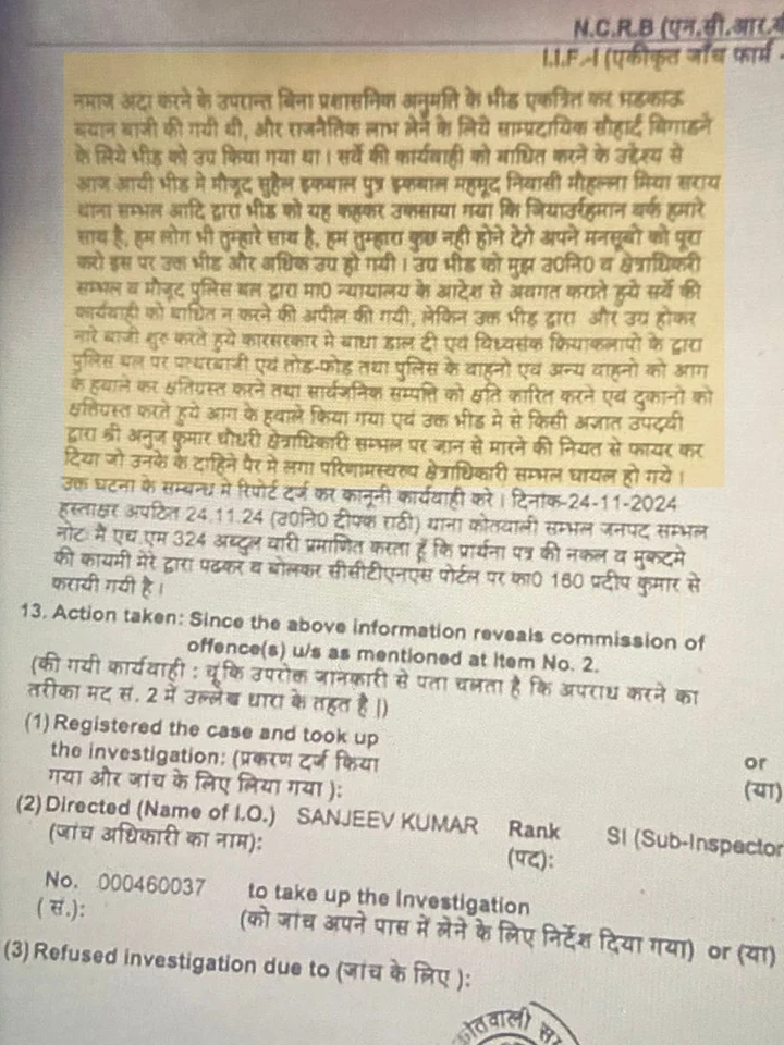FIR संख्या 335/24 में कहा गया है, "22 नवंबर को जियाउर्रहमान ने जामा मस्जिद में नमाज अदा करने के बाद बिना प्रशासनिक अनुमति के भीड़ जुटाई और भड़काऊ बयानबाजी की थी. उन्होंने राजनीतिक लाभ लेने के लिए सांप्रदायिक सौहार्द बिगाड़ने के लिए भीड़ को उग्र किया था."