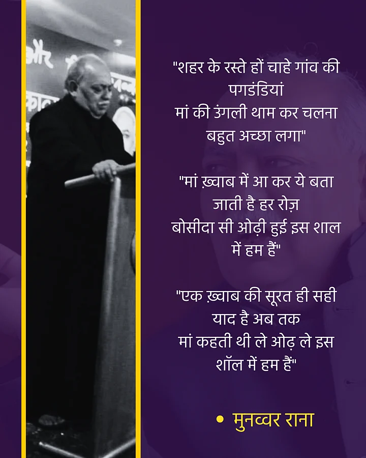 मुनव्वर राना साहब ने शायरी कहने का एक अलग रास्ता चुना. उनका कहना था कि "मां सिर्फ महसूस करने की चीज है, मां कभी कुछ कहती नहीं है, अगर आप मां को महसूस नहीं कर सकते, तो आप बेटे नहीं हुए."