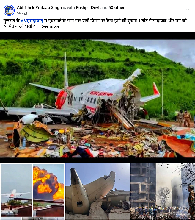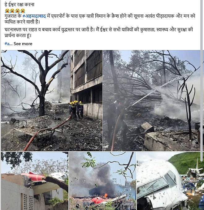 अहमदाबाद (Ahmedabad ) में हुए विमान हादसे के बाद इस हादसे की तस्वीरें सोशल मीडिया पर शेयर की जा रही है. इस बीच सोशल मीडिया पर कुछ ऐसी तस्वीरें भी शेयर की जा रहीं है जिनका 12 जून को हुए विमान हादसे से कोई संबंध नहीं है.