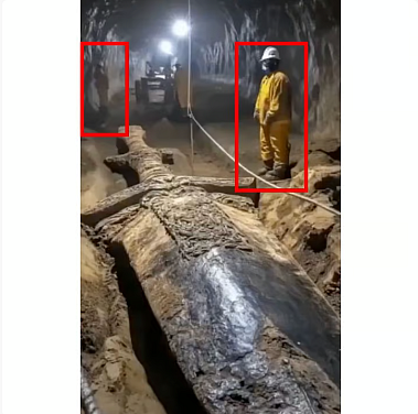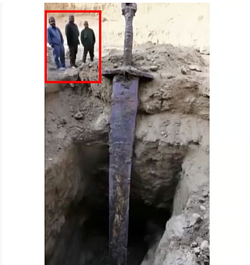 दूसरी फोटो में तीन आदमी विशाल तलवार को देखते हुए दिखाई देते हैं. उनके चेहरे की विशेषताएं स्पष्ट नहीं हैं, और वे बेहद छोटे दिखते हैं.