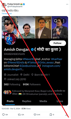 एक अलग तस्वीर इस दावे के साथ वायरल हो रही है कि News18 के एंकर अमीश देवगन ने अपने आधिकारिक X हैंडल पर "मोदी का कुत्ता" जोड़ा है.