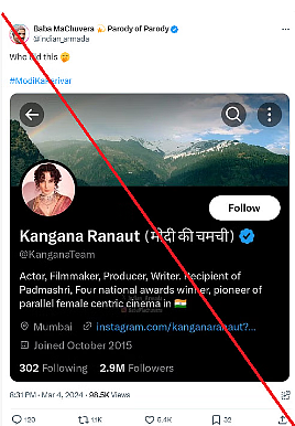 इसी तरह बॉलीवुड एक्ट्रेस कंगना रनौत के X हैंडल का एक स्क्रीनशॉट सोशल मीडिया प्लेटफॉर्म पर वायरल हो रहा है, जिसमें उनके नाम के आगे "मोदी की चमची" लिखा हुआ दिखाया गया है.