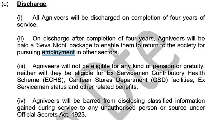 हमें जांच में क्या मिला?: दस्तावेज के 'डिस्चार्ज' सेक्शन में, सभी 'अग्निवीरों' को 'चार साल की सेवा' के पूरे होने पर डिस्चार्ज कर दिया जाएगा यानी कि छुट्टी दे दी जाएगी.
