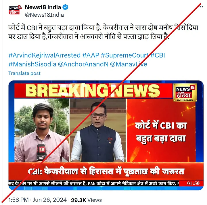 पोस्ट में कहा गया है कि केजरीवाल ने सिसोदिया को दोष देने के बारे में ऐसा कोई बयान नहीं दिया और CBI अब "भाजपा द्वारा संचालित" है.