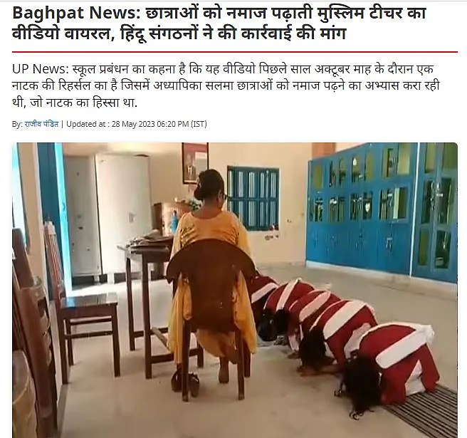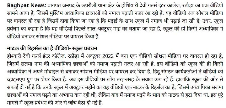 क्या है दावा?: वीडियो शेयर कर दावा किया जा रहा है कि उत्तर प्रदेश (Uttar Pradesh) के बागपत (Baghpat) के स्कूल में छात्राओं को नमाज पढ़ने की ट्रेनिंग दी जा रही है.
