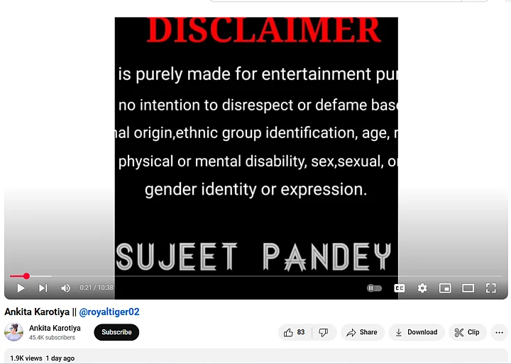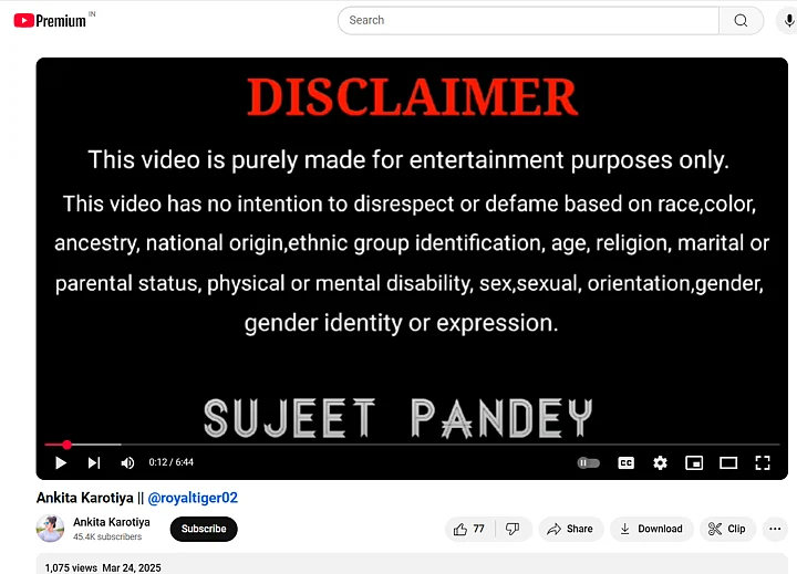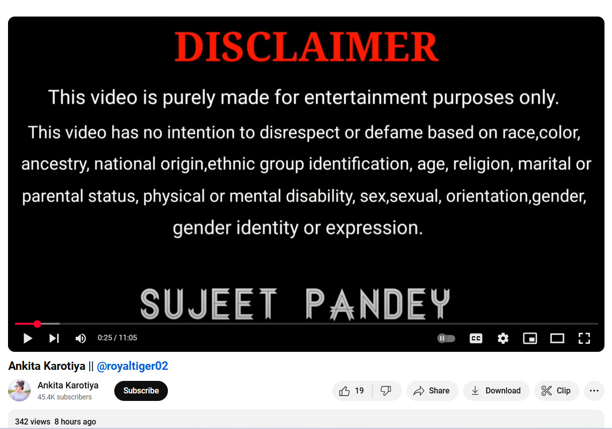 इस डिस्क्लेमर में लिखा गया है कि, "यह वीडियो केवल मनोरंजन के उद्देश्य से बनाया गया है. इस वीडियो का नस्ल, रंग, वंश, राष्ट्रीय मूल, जातीय समूह पहचान, आयु, धर्म, वैवाहिक या माता-पिता की स्थिति, शारीरिक या मानसिक विकलांगता, लिंग, यौन अभिविन्यास, लिंग, लिंग पहचान या अभिव्यक्ति के आधार पर अपमान या बदनामी करने का कोई इरादा नहीं है." (अंग्रेजी से हिंदी में अनुवाद)