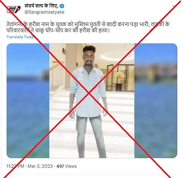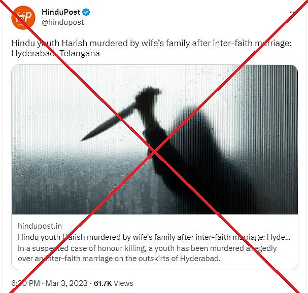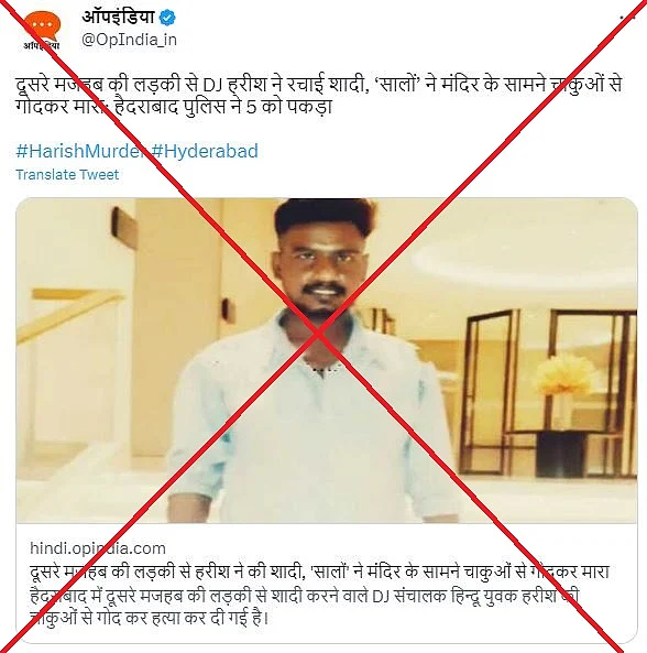 क्या है दावा?: दावा किया गया कि तेलंगाना (Telangana) के हैदराबाद (Hyderabad) में डीजे ऑपरेटर हरीश को एक मुस्लिम महिला से शादी करने की वजह से महिला के भाई ने हत्या कर दी.