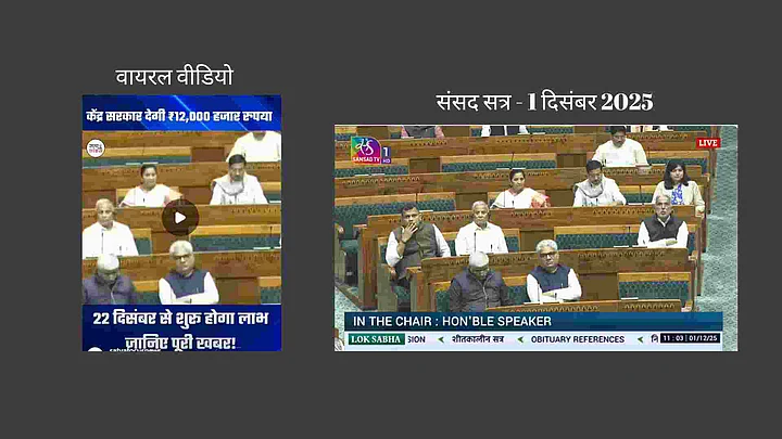 संसद के शीतकालीन सत्र के बीच सोशल मीडिया पर एक वीडियो वायरल है. वीडियो में लोकसभा स्पीकर ओम बिड़ला (Om Birla) ये घोषणा करते दिख रहे हैं कि 5 लाख से कम आय वाले परिवारों के लिए 12,000 रुपए की सहायता राशि देने से जुड़ी योजना लाई जा रही है. वीडियो को शेयर कर दावा किया जा रहा है कि ये योजना 22 दिसंबर से शुरू होगी.