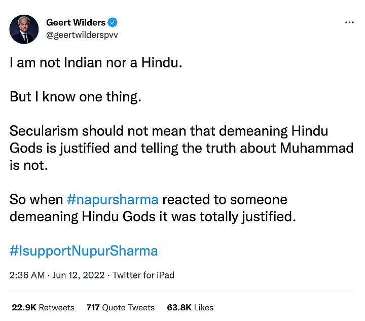 विल्डर्स ने अपने वेरिफाइड ट्विटर अकाउंट से शर्मा के समर्थन में और उनके खिलाफ की गई कार्रवाई और विरोध पर सवाल उठाते हुए कई ट्वीट किए हैं.