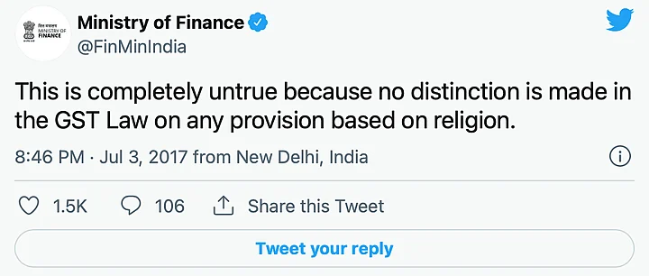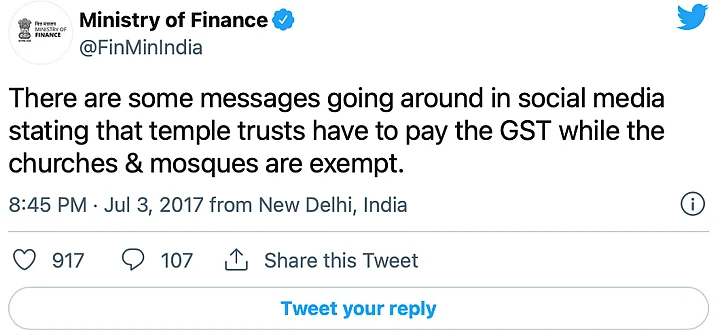 प्रेस रिलीज में कहा गया था ''सोशल मीडिया पर कुछ मैसेज शेयर किए जा रहे हैं कि मंदिर ट्रस्टों को जीएसटी का भुगतान करना होगा, जबकि चर्चों और मस्जिदों की छूट दी गई है. ये पूरी तरह से झूठ है, क्योंकि धर्म के आधार पर किसी भी प्रावधान पर जीएसटी कानून में कोई भेद नहीं किया गया है.''