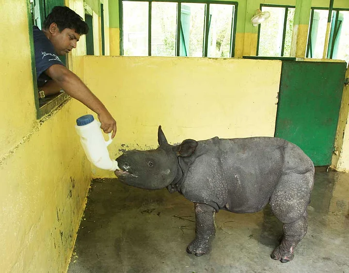 For wildlife veterinarian Panjit Basumatary, the biggest challenge of hand rearing this 3-4 month rhinoceros calf is the absence of the mother rhino to whom the baby would be deeply attached for the first four years of his life.
