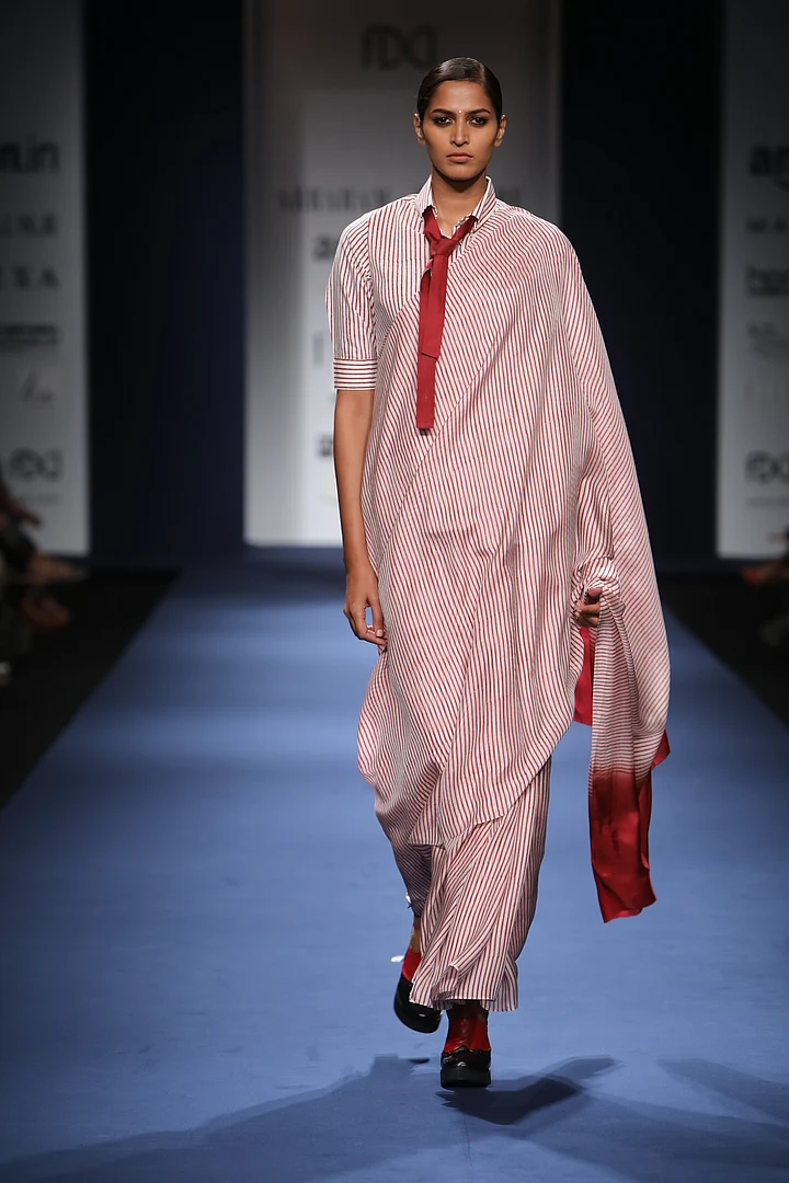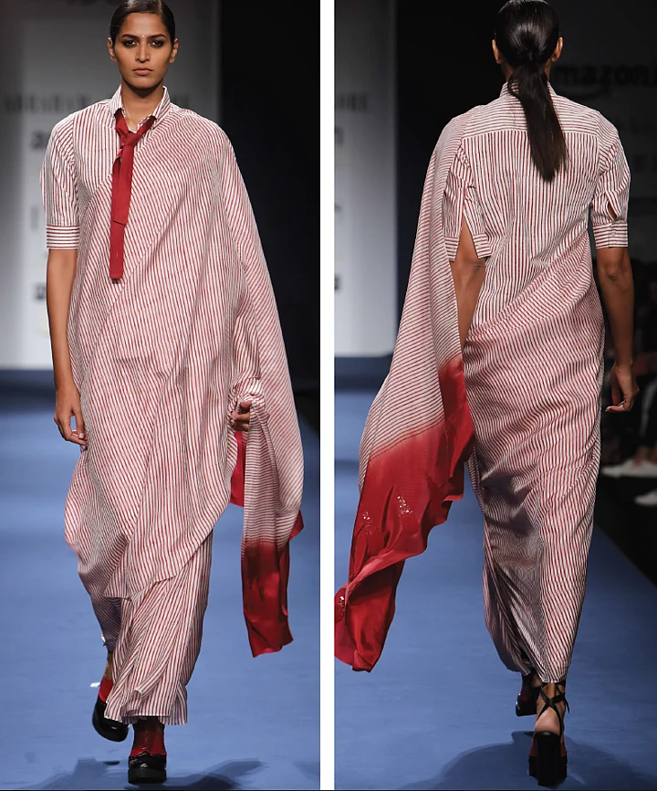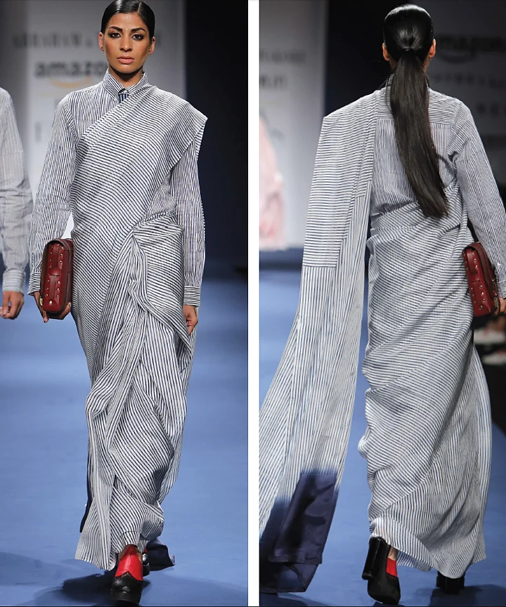 Pinstripes, an 80s favourite, have long been associated with the masculine. In using these in sarees as part of their Back to Work collection, designer duo Abraham and Thakore challenge two hegemonies – one of the pinstripe as a masculine pattern, and the other, of its dominance in Western society.