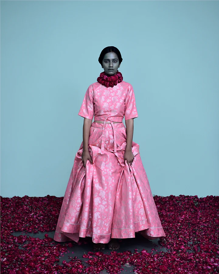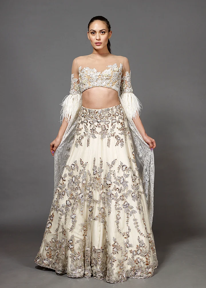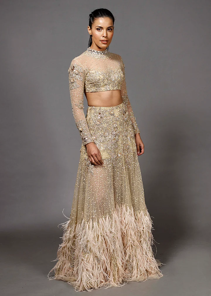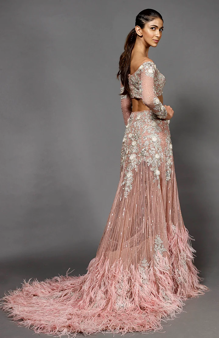 By placing these threaded hems on the trains of opulent skirts and glamorous blouses, Malhotra once again places elegance at the epicentre of wedding wear, although its lightness is a stark contrast and a weak competition to the heaviness of Indian couture.