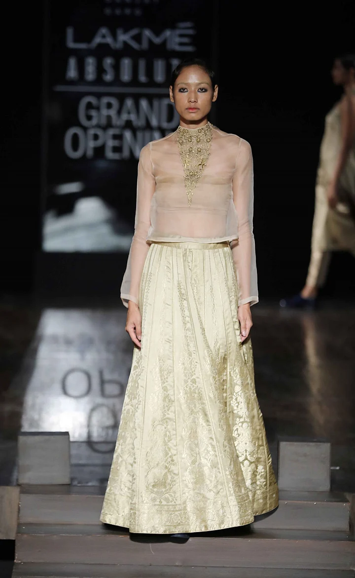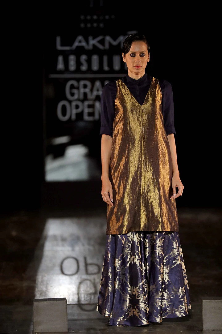 Putting his own version of ‘Liquid Gold’, Lakmé’s new beauty theme, Garg brings in textured beaten metallics and gives them a raw soul.