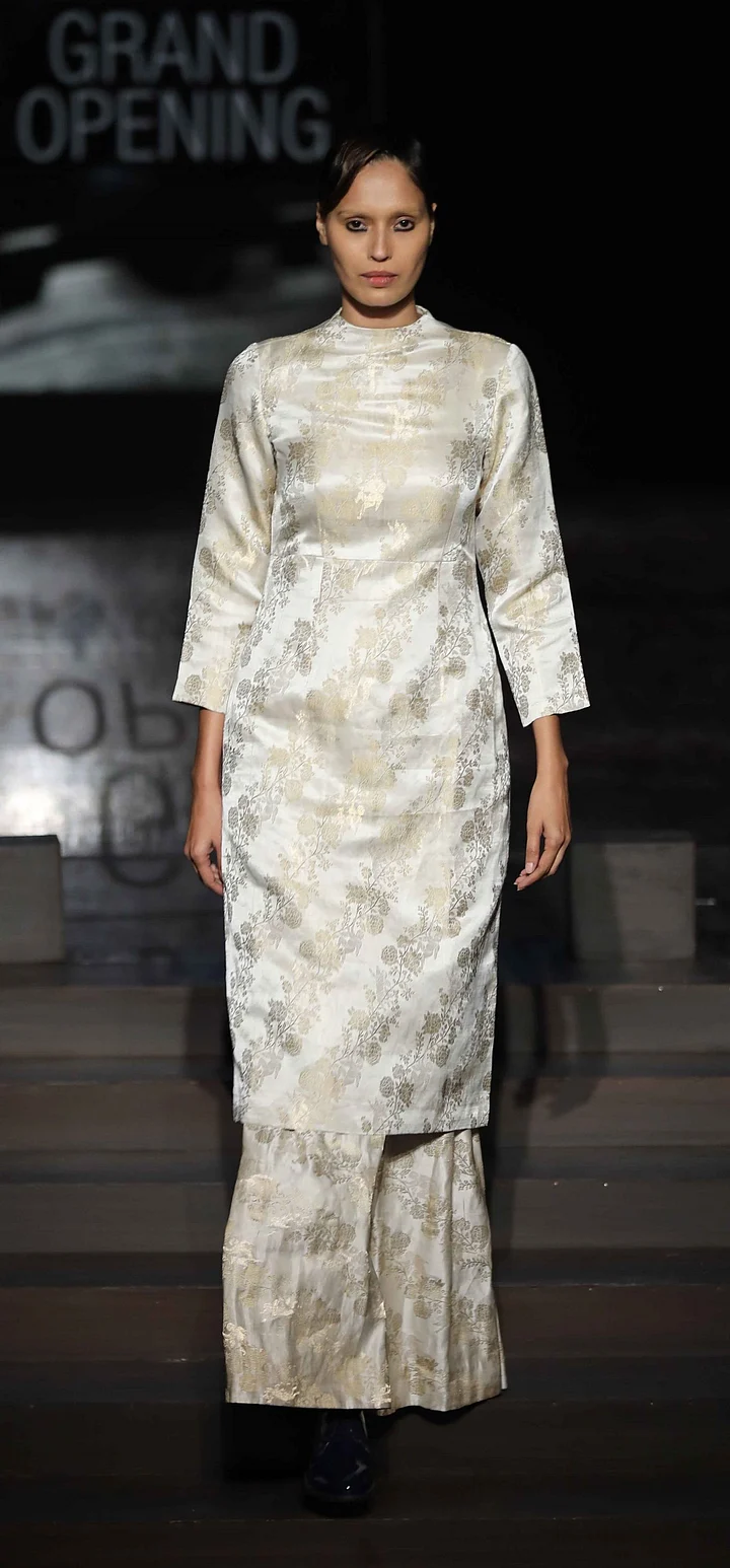 First, let’s take you through a minute detail of the collection: Do you see those scalloped clouds of angels in flight? This interesting detail, made through handcrafted Chikankari on Bengal mul, zardozi and handwoven brocade, is seen all through the collection.