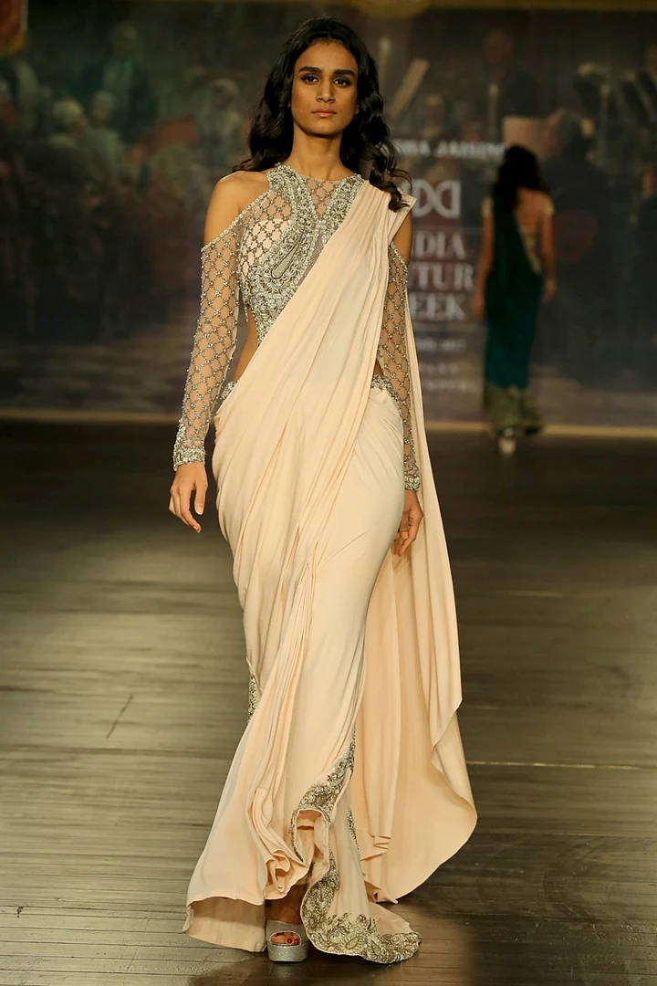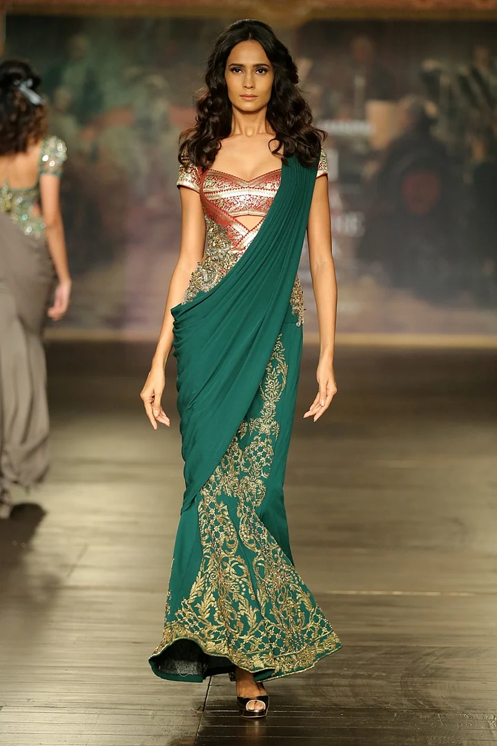 Keeping her love for the dramatic consistent, this time too Monisha had a lot of concept lehengas, evening dresses, cocktail saris and evening gowns in her Ópera collection.