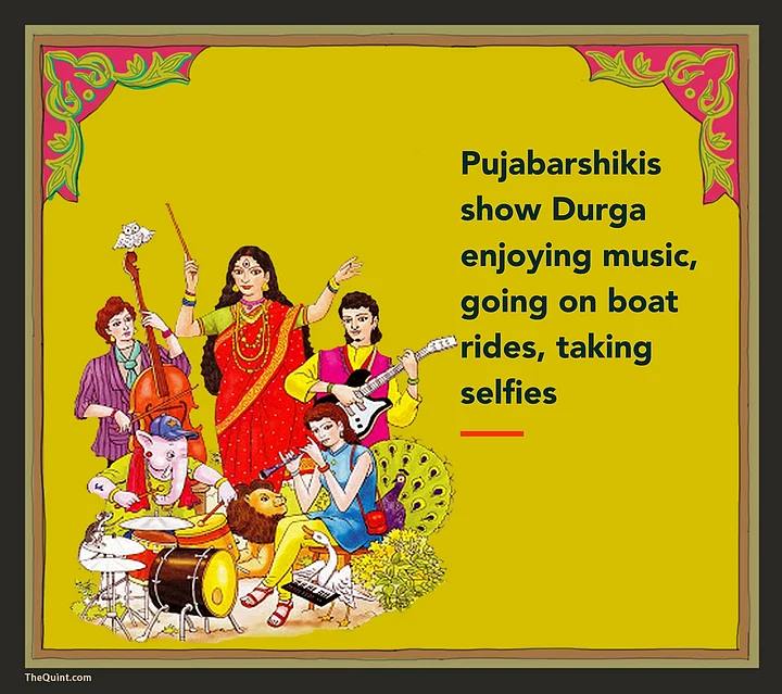 The covers of popular Pujabarshikis show Goddess Durga playing, enjoying music, going on boat rides, and taking selfies among other things. Such representations are proof of the fact that Bengal has a long tradition of humanising its deities while celebrating their sanctity.