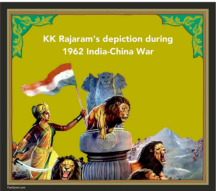 During the 1962 India-China War, an image depicting the Ashokan Pillars surrounded by Bharat Mata (drawn as Goddess Durga) and her fierce lions became popular. The image represented the Goddess as the protector of the disputed Himalayan border.