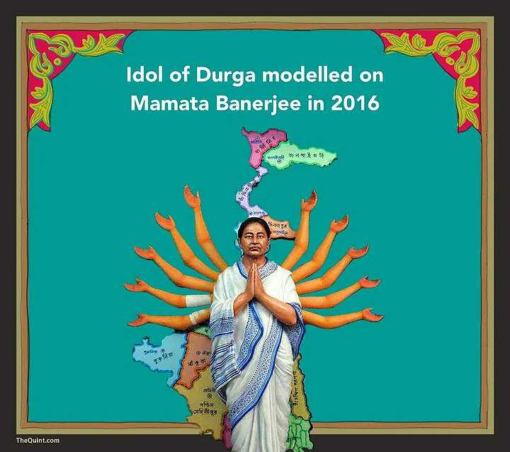 A more recent example is from 2016, when an idol of Durga was modelled on Mamata Banerjee. The idol depicted the West Bengal Chief Minister in her trademark saree and slippers with her many arms serving as supporting pillars for railways, education, and infrastructure among other industries.